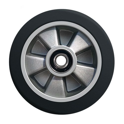 Колесо резиновое D180 предназначено для тележек и складской техники. Контактный слой изготовлен из резины. В оси установлен шариковый подшипник. Колесо оснащено алюминиевым ободом. Обладает высокой износостойкостью и эластичностью. Не оставляет следов на напольных покрытиях.
