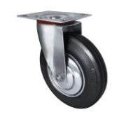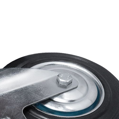 Колесо промышленное поворотное с тормозом SCB93 предназначено для мусорных контейнеров, промышленного оборудования, платформенных тележек, лесов и строительных вышек-тур. Шинка выполнена из литой, черной резины. Колесо имеет стальной оцинкованный обод. В оси установлен роликовый подшипник. Кронштейн с платформенным креплением изготовлен из оцинкованной стали. Отличается средней устойчивостью к воздействию химических веществ. Может передвигаться по грубой поверхности и эксплуатироваться в условиях влажной среды.